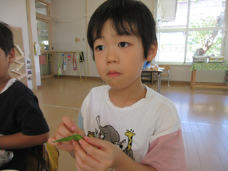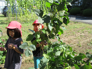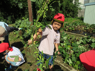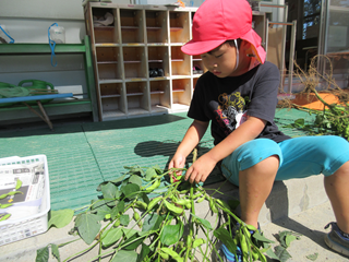 畑から幼稚園にもってきて、1つずつさやをもぐ作業も