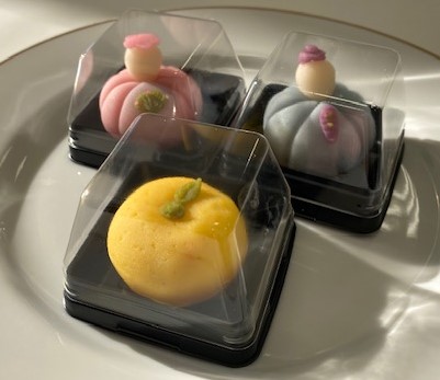 とは言えど、皆さん初心者ですので、ゆあさ先生が丁寧に指導しひとつずつ仕上げていきました。今回は、おひな様・みかん・抹茶・桜の練り切りとマシュマロ風お餅で餅菓子を作りました。色つけされた求肥を丸めて形成していくわけですが、参加者それぞれ同じ材料なのに少しずつ違い、個性のある作品に上手に仕上がりました。初めてとは思えないできばえに大満足!!