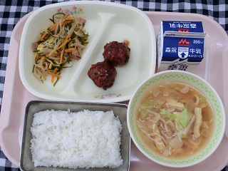 ごはん、肉だんご(幼小2個、中3個)、昆布とごぼうの炒め煮、だいこんのみそ汁