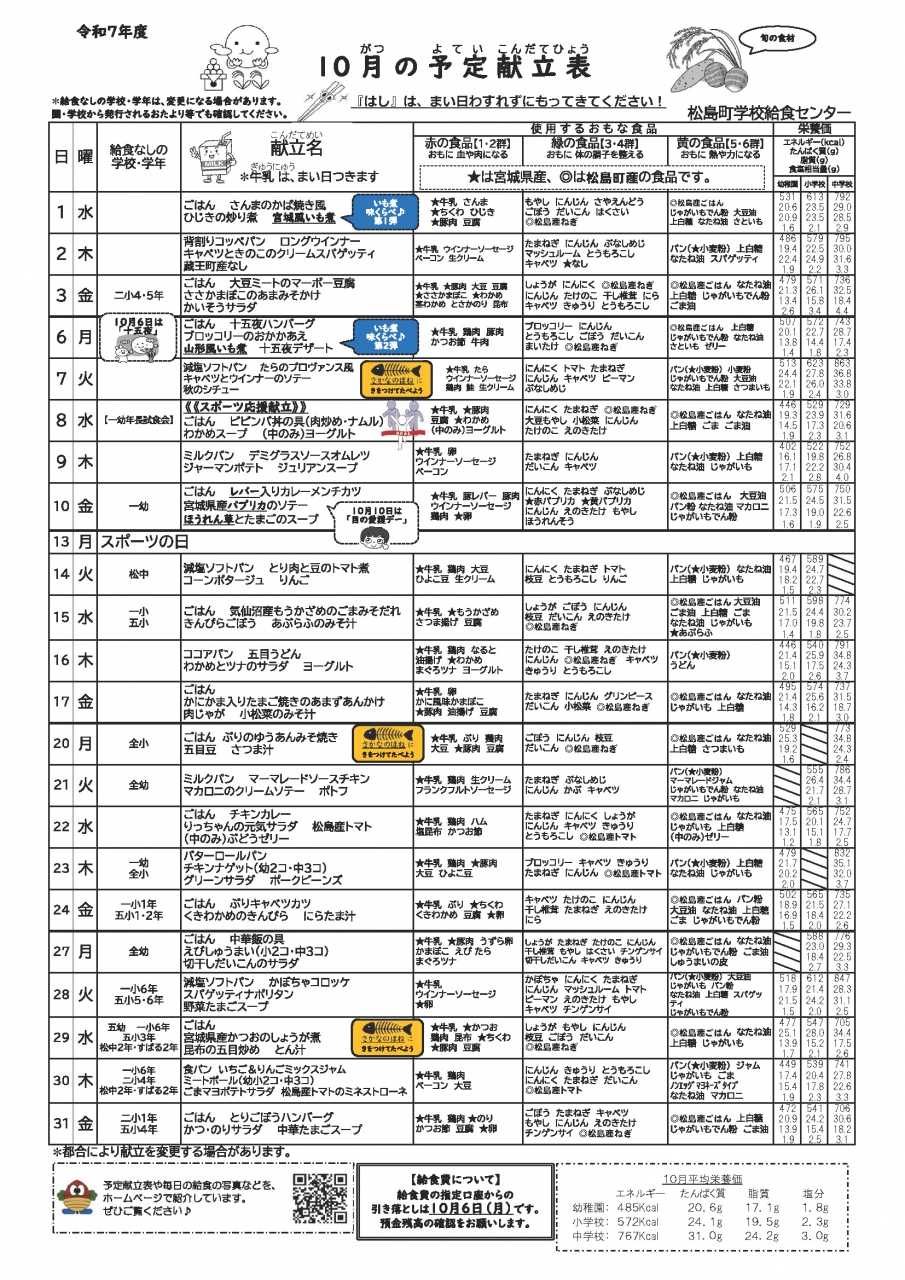 松島町学校給食センターでは、「今日の給食」や毎月の「予定献立表」、「一口メモ」などを発信しております。
