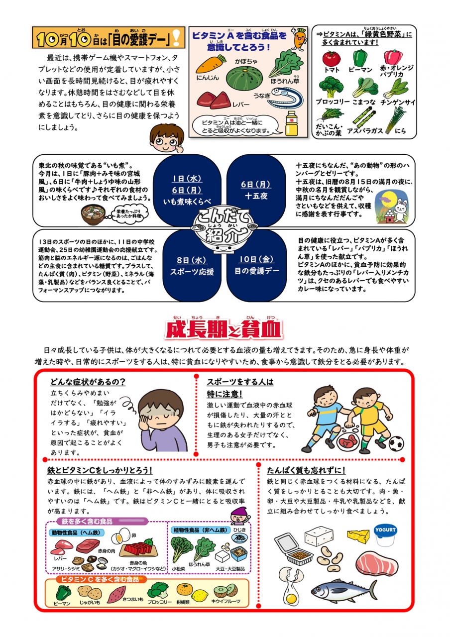 特に「一口メモ」では、その日の献立にまつわるお話を掲載しておりますので、様々な料理、色々な食材や栄養素等の知識、地域の食文化などを学ぶことができます。ぜひご覧いただき、ご家庭でも給食のお話や食に関する話題などで、児童生徒の「食への関心」を高めていただければ幸いに存じます。