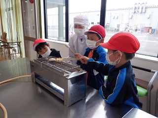 ▲かまぼこ工場では,実際に自分たちでかまぼこ焼きを体験しました!!