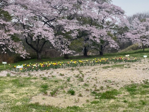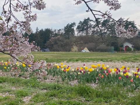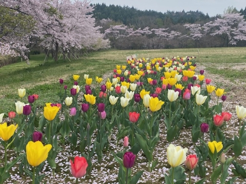 何度もお伝えしておりますが、昨年の11月に町内の有志6名により球根を植え付けたのですが、いのししの被害もなくなんとか咲いてくれました!今正に見頃です。桜の花が散りつつありますが、風が吹く度に花びらが舞い、地面に花びらの絨毯となりそしてチューリップ・・・。