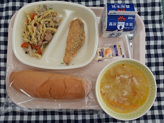 今日の給食は、ソフトパン、さけフライ(タルタルソース)、きのこソテー、かぶとベーコンのスープです。