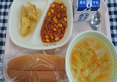 今日の給食は、ソフトパン、チリコンカン、キャベツとベーコンのスープ、キャラメルポテト です。