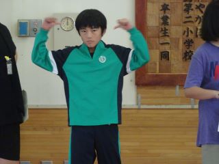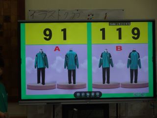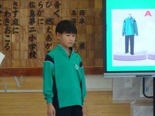 AとBの運動着を着た5年生は、6年生のプレゼンテー