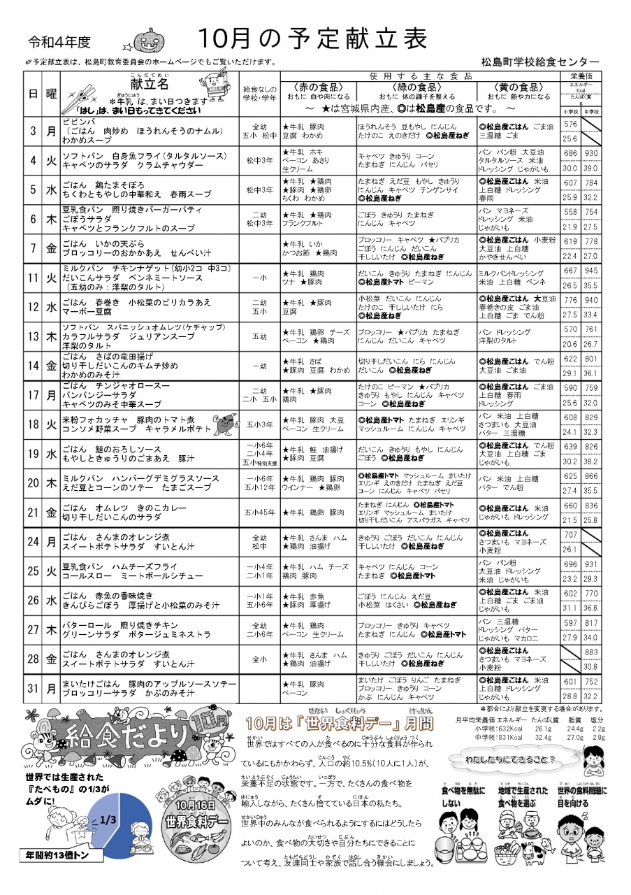 松島町学校給食センターでは、「今日の給食」や毎月の「予定献立表」、「一口メモ」などを発信しております。