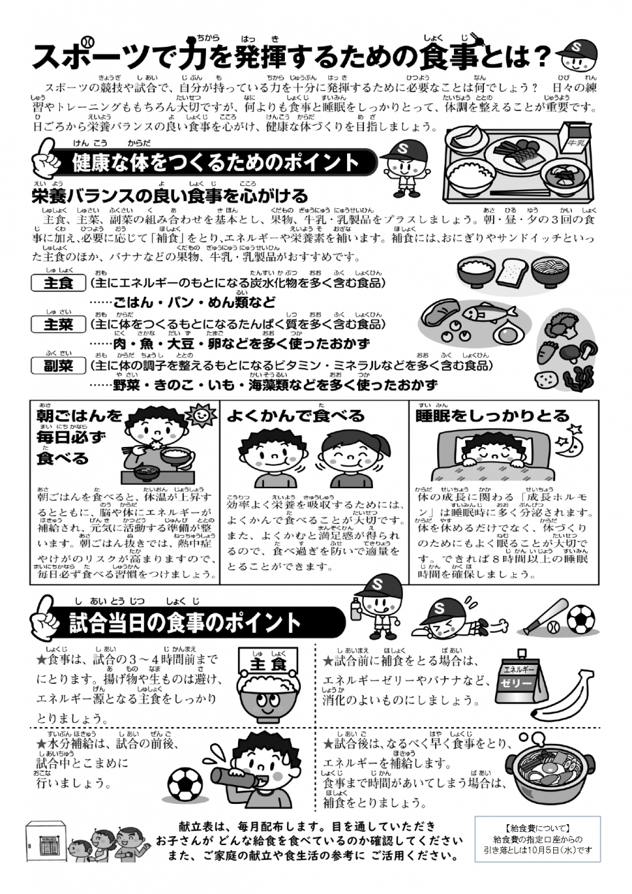 特に「一口メモ」では、その日の献立にまつわるお話を掲載しておりますので、様々な料理、色々な食材や栄養素等の知識、地域の食文化などを学ぶことができます。ぜひご覧いただき、ご家庭でも給食のお話や食に関する話題などで、児童生徒の「食への関心」を高めていただければ幸いに存じます。