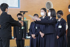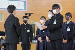 今期生徒会スローガンは『Cloth~絆ぐ~』です。『Cloth』には、布という意味があります。皆さん一人一人が「糸」となり、様々な場面で協力し合い、互いがクロス(Cross)し合っていくことで,つながり,よりよいものを生み出してほしいという思いが込められています。サブタイトルの「絆ぐ」も、互いにあいさつを交わし、人と人がつながっていくことを大切にしていきたいという意味を込めました。このスローガンの一人一人の心の中に掲げ、学校生活の様々な場面で人との関わりを大切にする気持ちをもって生活してほしいと考えています。