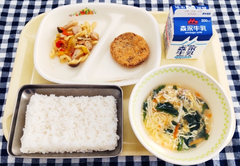 今日の地場産物は、松島産ごはん、松島産ねぎ、豚肉、わかめ、牛乳です。