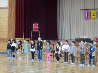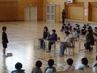 24日(金)1年生を迎える会を行いました。  1年生は6年生と手をつないで入場しました。  2年生による「はじめの言葉」 「4年生さん、お返事してください。」「はーい!」 各学年の紹介もしてくれました。     6年生による「1年の行事の紹介」 運動会、学習発表会、動物園見学、たてわり活動を寸 劇で発表しました。   5年生によるクイズ 低学年を入れて3,4人のグループを作りました。 楽しい学校クイズの連続でした。  1年生の発表。 「さんぽ」の替え歌を大きな声で歌いました。 とても上手でした!  3年生による終わりの言葉。 「ありがとうの花」の歌を「おめでとう」の替え歌で お祝いしました。  司会をした運営委員の皆さん。 とても立派でしたよ! 全校が一堂に会し、有意義な時間を過ごすことができ ました。 |