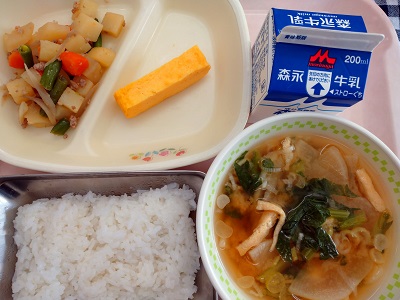 今日の給食は、ごはん、たまご焼き、じゃがいものそぼろ煮、小松菜と油揚げのみそ汁 です。