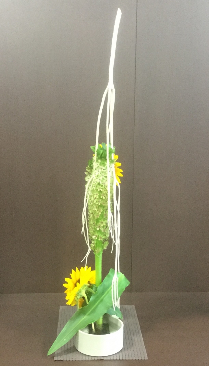 中央にパイナップルリリーを、それを取り巻くようにひまわり(夏の定番)をあしらっています。