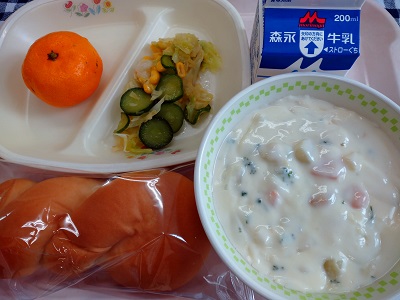 今日の給食は、ツイストパン、シーフードのクリームシチュー、松島産キャベツのサラダ、みかん です。
