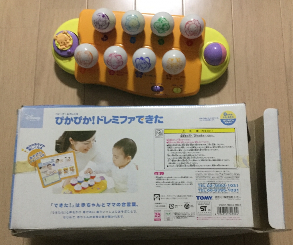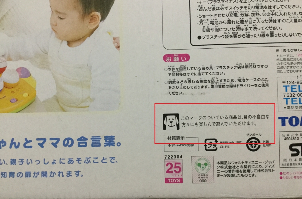 写真のおもちゃは、昔トミーから発売されていた商品名「ぴかぴか!ドレミファできた」というものです 光と音でドレミファを教えてくれるもので、小さいお子さんをもつ親御さんには大人気の商品でした。 このおもちゃは「晴盲共遊玩具」といって、音が出ますので目の不自由な人も一緒に遊べるようになっています。 目の不自由な人も,そうでないひとも一緒に遊べるおもちゃには、盲導犬をデザイン化したマークが商品箱に描かれています。