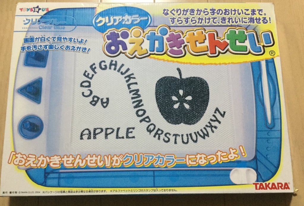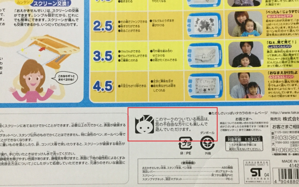 次に、何度書いても消せるというタカラ発売されていた「おえかきせんせい」という商品です。大抵の保護者は購入して子どもたちと遊んだのではないでしょうか。 これも「晴盲共遊玩具」で、こちらは耳の不自由な子どもたちにも遊べるようになっています。 この商品箱には、ウサギをでサイン化したものが描かれています。