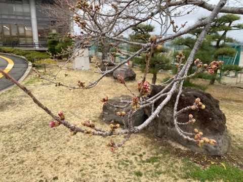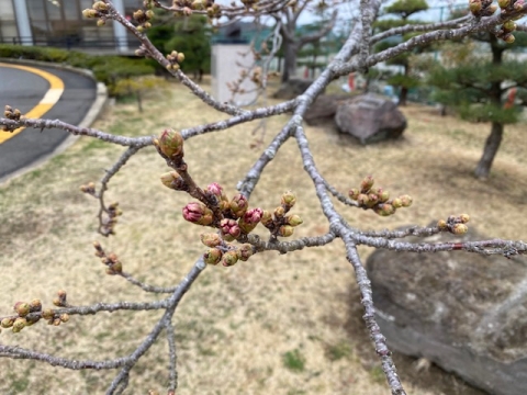 4月3日(木)の文化観光交流館施設内の桜の状況です。まだ蕾ですが、少しずつ色づいてきました。