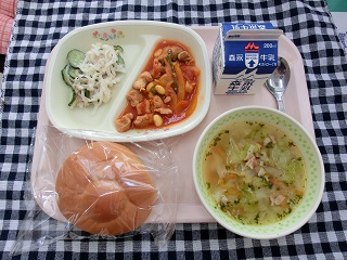 本日は、白、赤、黄色ととても彩りの良い献立で、チキン、ツナ、スープのベーコンのうまみが出ていて、とても美味しい給食でした。