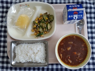今日の給食は、ごはん、ポークカレー、くきわかめのサラダ、冷凍カットりんご、牛乳です。