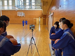 バスケットボールの授業では、自分のシュートフォームを動画でチェックすることで、効果的なシューティングの習得を目指しています。個人で確認するだけでなく、お互いに学び合う相乗効果が生まれています。