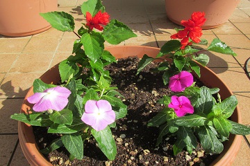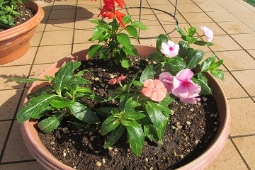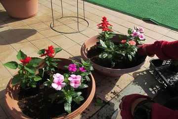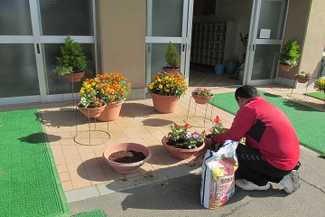 玄関の花を植え替て頂きました。毎回プランターの花を植え替えている先生はS先生です。(後ろ姿で分かりますか?)