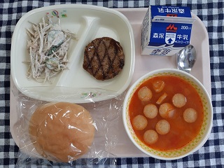 今日の給食は、丸パン、てりやきバーガーパティ、ごぼうサラダ、ミネストローネ、牛乳です。