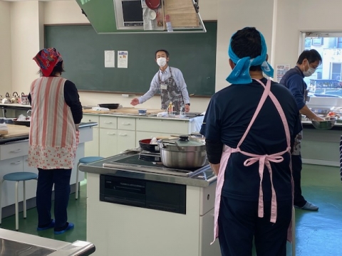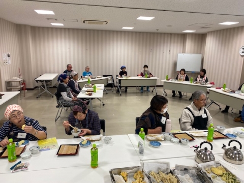 新そば粉を使って練り上げ、打ち粉を振って、リズムよく切る作業にみなさん真剣に取り組んでいました。ゆであがったそばなどもいちょうの会のみなさんが綺麗に配膳してくださり、会の村山会長が、「私達もそばを作りながら会話が弾むことが楽しい」と話してくれました。参加者分の天ぷら各種(いも・なす・えび・かぼちゃなど)を手際よくあげてくださった大内さんの腕前もよく、サクサクの天ぷらと共に美味しい試食会となりました。自分で作ったそばの味は格別であったことでしょう。