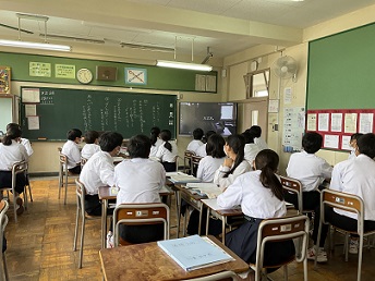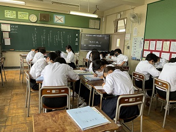 いじめ単元のまとめとして視聴した動画は、今年度、生徒会執行部が制作した「いじめ防止CM」と手記音声を真剣な表情で聴きました。