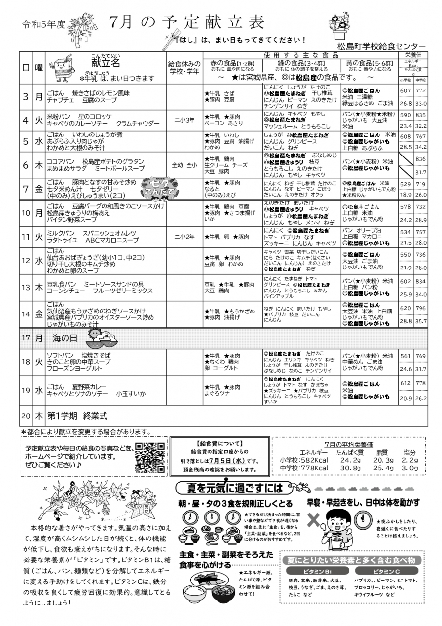 松島町学校給食センターでは、「今日の給食」や毎月の「予定献立表」、「一口メモ」などを発信しております。