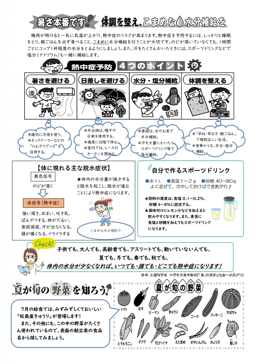 特に「一口メモ」では、その日の献立にまつわるお話を掲載しておりますので、様々な料理、色々な食材や栄養素等の知識、地域の食文化などを学ぶことができます。ぜひご覧いただき、ご家庭でも給食のお話や食に関する話題などで、児童生徒の「食への関心」を高めていただければ幸いに存じます。