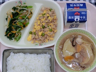 | 今日の献立 ごはん、とりたまそぼろ、小松菜のおひたし、せんべい汁 本日の地元食材は、ごはん、たまねぎです。 今日は、せんべい汁には、南部せんべい、だいこん、にんじん、ごぼう、鶏肉他、たくさんの具材が入っておりコクのあるしょうゆ味で、そぼろは、しょうがが効いてさっぱりとした後味で、ごはんが進みました。 せんべい汁は、青森県八戸市周辺の郷土料理で、宮城県登米地方の郷土料理のはっと汁と食感や味が似ている感じがしました。 江戸時代に東北地方は冷害や厳しい年貢で、なかなかお米を食べることが出来ず、小麦を原料とした、せんべい汁やはっと汁が生まれたようです。 各地の郷土料理が生まれたいきさつなどを、お子さんと調べてみるのも良いのではないでしょうか。 |
