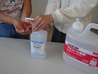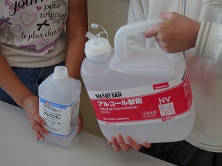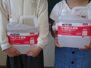 ▲いただいた消毒用アルコールは全校児童で大切に使わせていただきます!!
