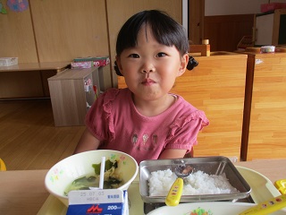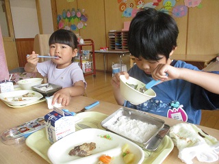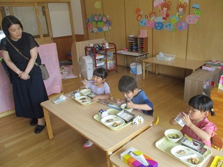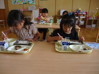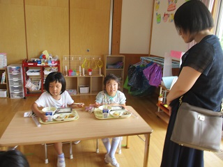 給食の時間には、普段どんな風に食べているのかを見てもらいました