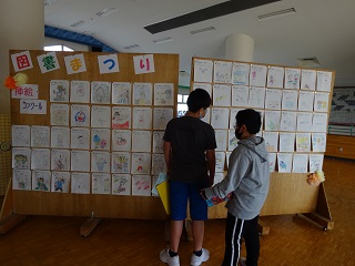 入り口付近には、子供たちが「イチオシ」の本の表紙や挿絵を題材に描いた絵を掲示して、どの絵が好きか投票する「挿絵コンクール」も同時に開催しています。子供たちは絵を見て「絵がうまい。」「この本、読んだことがある。」など思い思いの感想を口にしています。また、子どもたちがいろいろなジャンルの本を読むように「読書ビンゴ」も行っています。(詳しくは子供たちから聞いてみてください。)