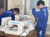 2年生家庭科と保健体育の授業です。家庭科では小物入れの仕上げを丁寧に行っていました。