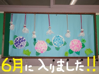 ▲梅雨空が続きますが,青空を願って「てるてる坊主」や「あじさい」「カエル」が手作りです。とても手が込んでいて,見ていて爽やかな気持ちになります!!