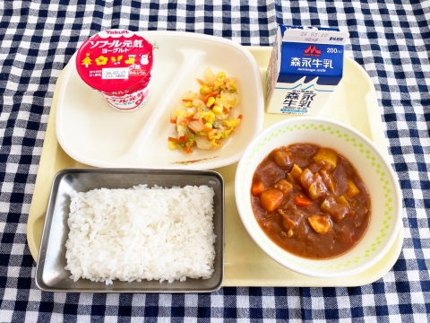 肉や野菜、海藻やくだものなどがバランス良く使われていて、テーマの通り、午後の活動もがんばれそうな献立です。