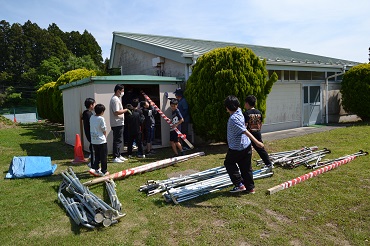 テーブルやパイプ椅子を運んだり、テント、万国旗などの