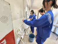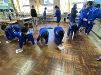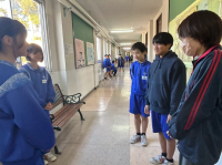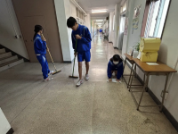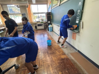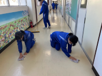 清掃時間は掃き掃除や水拭きを協力して行っています。班で分担を決め、初めに段取りを決め、素早く丁寧に行っています。