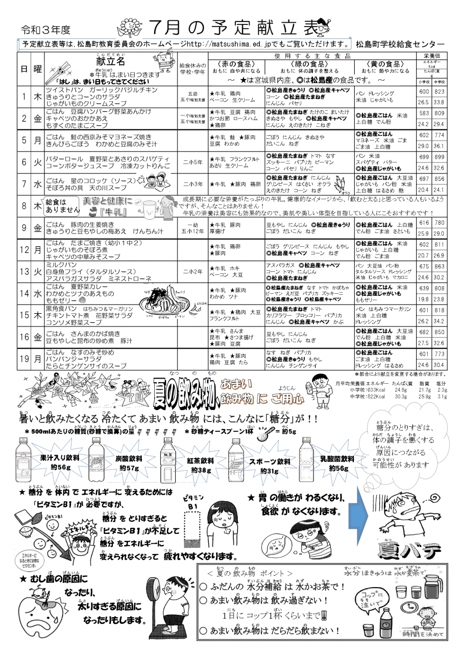 松島町学校給食センターでは、「今日の給食」や毎月の「予定献立表」、「一口メモ」などを発信しております。