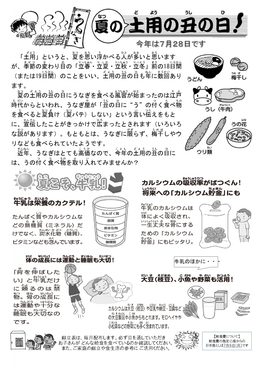 特に「一口メモ」では、その日の献立にまつわるお話を掲載しておりますので、様々な料理、色々な食材や栄養素等の知識、地域の食文化などを学ぶことができます。ぜひご覧いただき、ご家庭でも給食のお話や食に関する話題などで、児童生徒の「食への関心」を高めていただければ幸いに存じます。