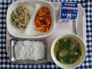 今日の給食は、ごはん、いかとえびのチリソース、バンバンジーサラダ、チンゲンサイのスープ、牛乳です。