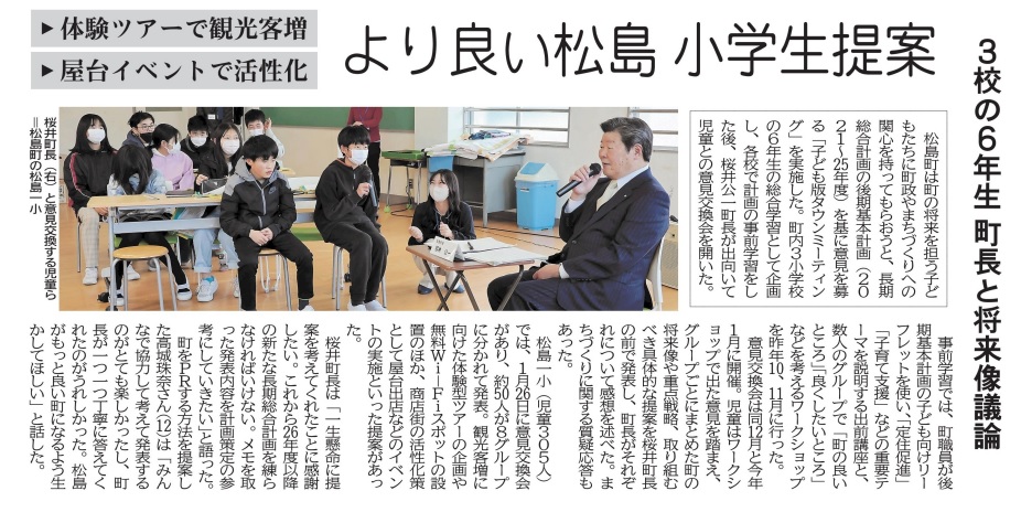 2日(土)の河北新報に松島町の3校の6年生がタウンミーティングをした記事が載りました。