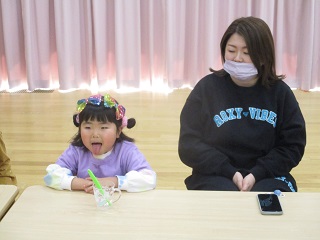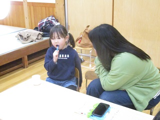 お別れ会のデザート後に家族の方にあいうべ体操と歯磨きの様子を見ていただきました