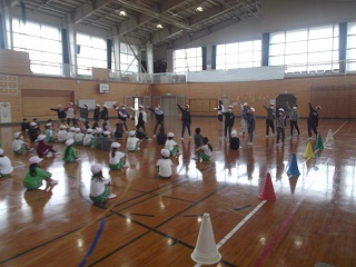 赤組が2階ホール、白組が体育館に集まり、ぞれぞれ