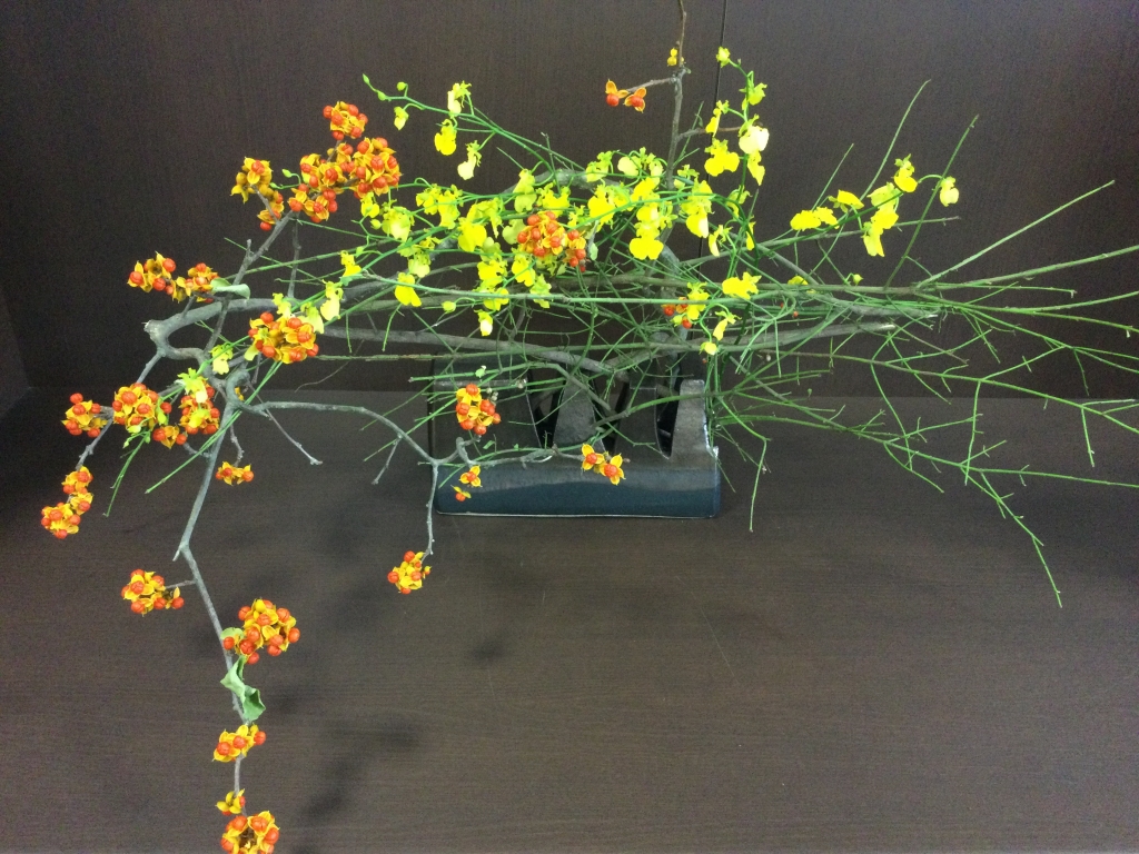 花材は、オンシジューム、ツルウメモドキの2種類です。