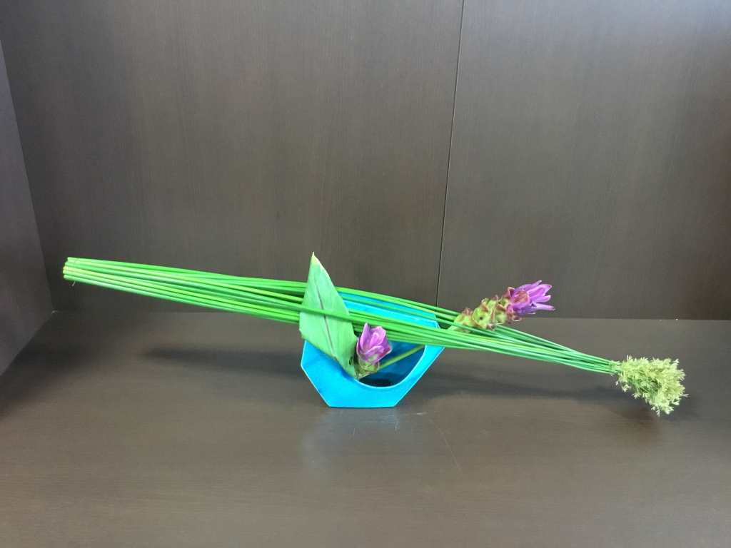 花材は、フトイとクルクマで、フトイが水に浸ってないので、すぐに黄色く変色するということで、朝イチの作業になったわけです。