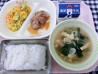 | 今日の献立 ごはん、照り焼きチキン、かぼちゃのセサミサラダ、小松菜のみそ汁 本日の地元食材は、お米、紅爵かぼちゃです。 今日は、松島産の紅爵かぼちゃを使ったサラダで、味付けには、すりごま、ハムが入っており美味しい味付けで、また、紅爵かぼちゃの特徴である皮の鮮やかなオレンジ色、かぼちゃの黄色、きゅうりの緑色と目からも食欲をそそるサラダでした。 みそ汁は、小松菜、大根、にんじん、じゃがいも、油揚げ、ねぎと具だくさんで、食べ応えがありました。 昨日までとは、一転して梅雨寒の天気になりました。 気温、湿度の変化が激しい時は、風邪などをひきやすくなるので、食事をしっかりととり、さらに、十分な睡眠で病気を寄せ付けない身体作りをしましょう。 |