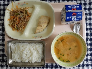 今日の給食は、ごはん、ほっけの塩焼き、きんぴらごぼう、豆腐のみそ汁、牛乳です。