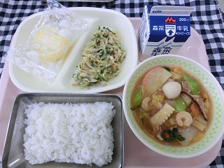 中華飯は、えび、いか、かまぼこ、豚肉、うずらの卵とたっぷりの野菜が入り、中華の風味もしっかりし、バンバンジーサラダは、鶏肉を細かくして野菜と和えてあり、ともに美味しい給食でした。